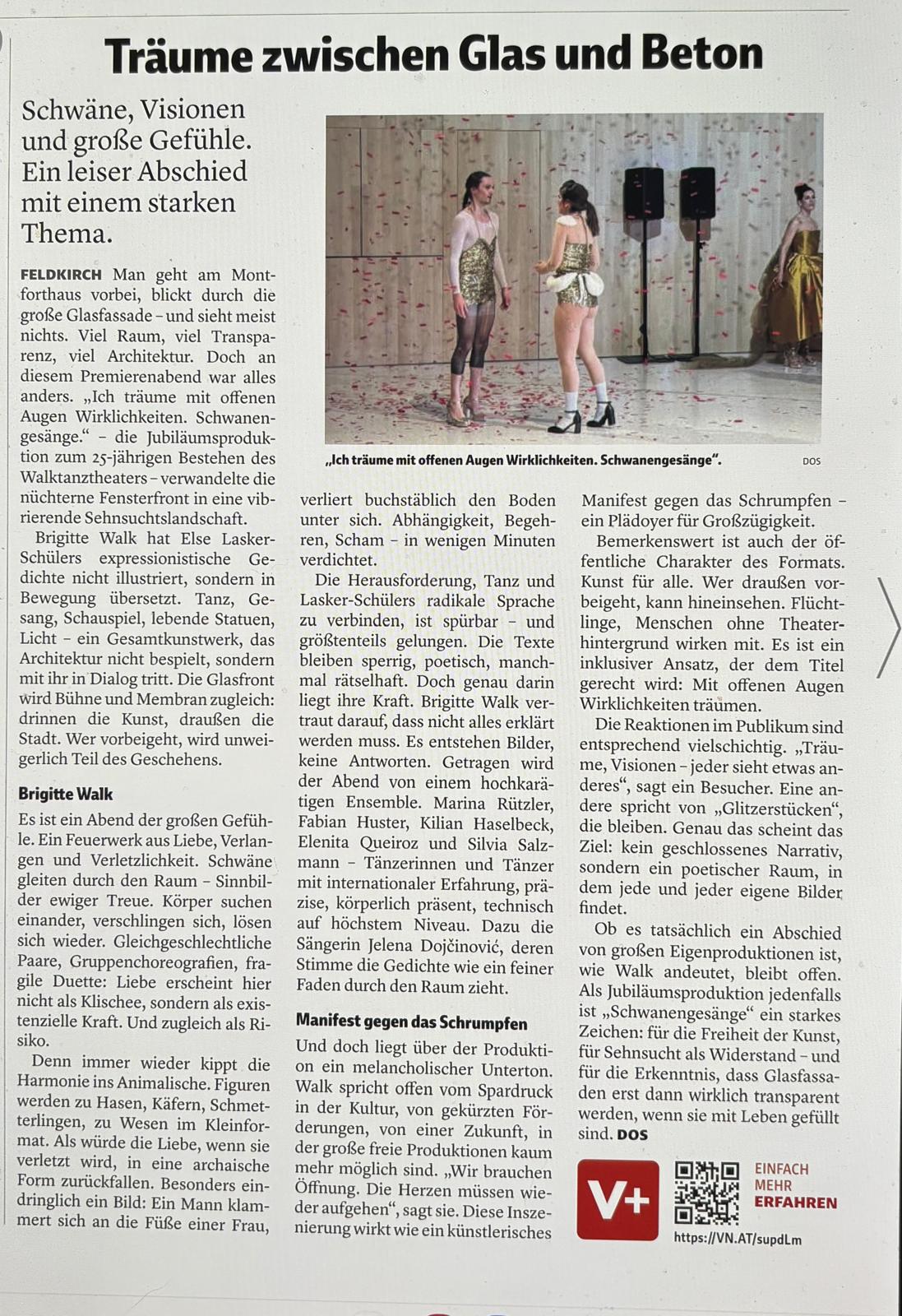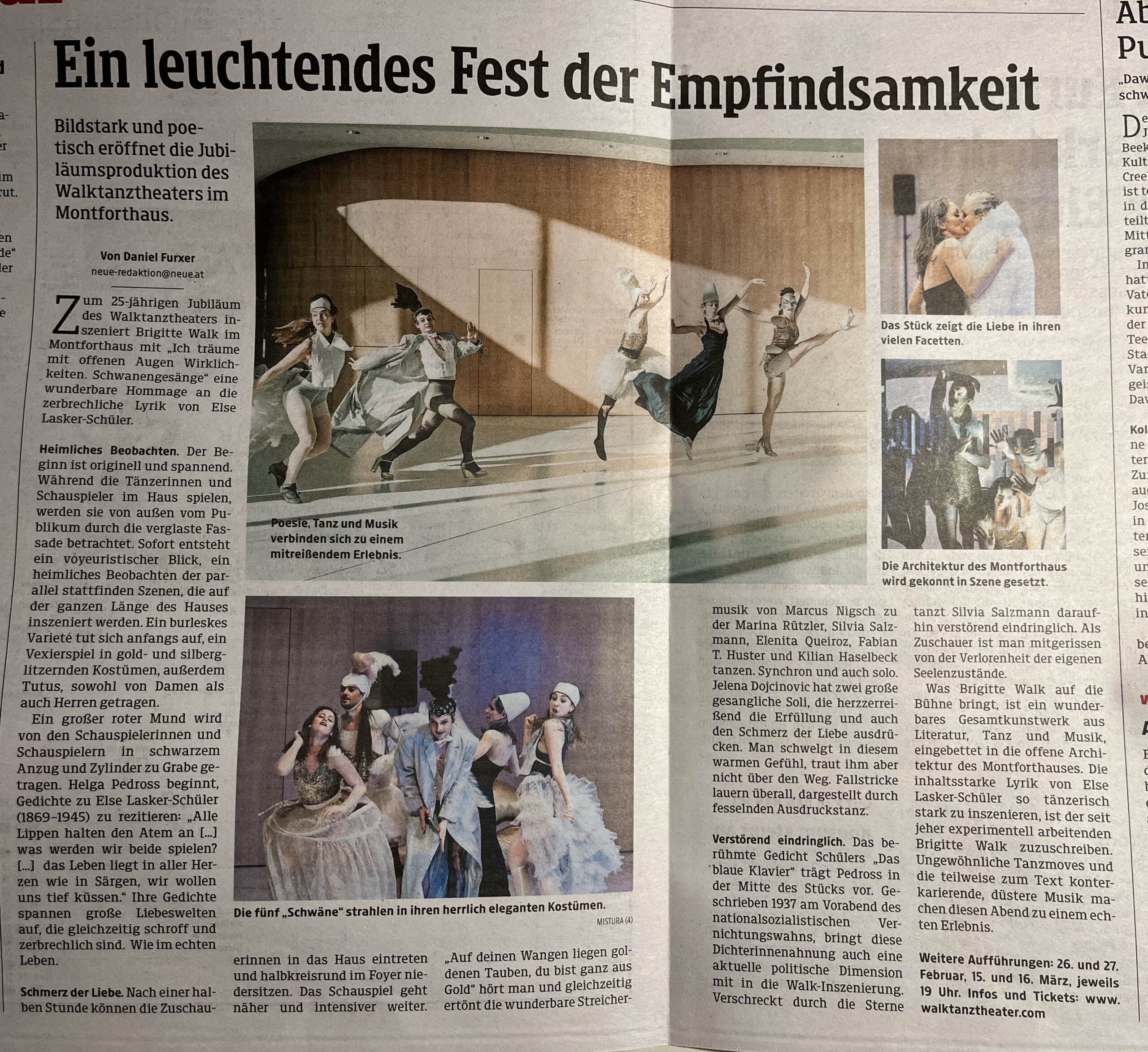 „Ich träume mit offenen Augen Wirklichkeiten. Schwanengesänge.“ Die Jubiläumsproduktion zum 25-jährigen Bestehen des Walktanztheaters – verwandelte die nüchterne Fensterfront [des Montforthauses] in eine vibrierende Sehnsuchtslandschaft.“ (VN, Dominique Sohm)